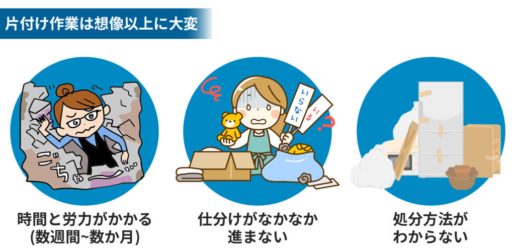 しかし、大量の荷物を仕分ける作業は想像以上に時間と労力がかかります。特に遠方の実家の場合は通うだけでも負担となり、片付けに数週間かかってしまうケースも珍しくありません。