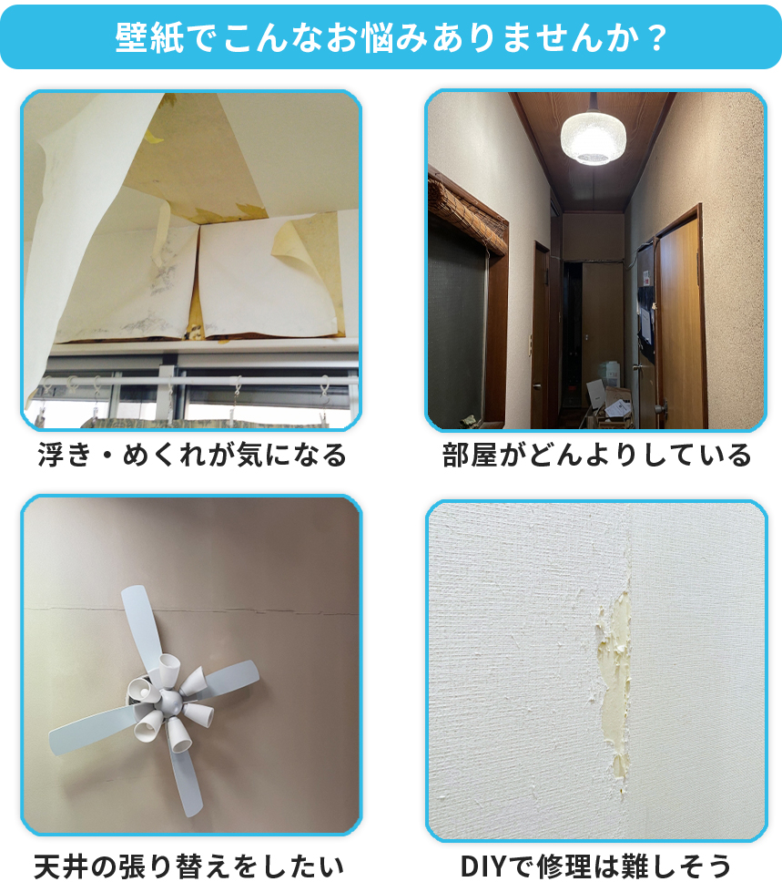 メッセージ:壁紙は毎日目にするものだから、ちょっとした汚れや剥がれがあるだけでも気になってしまうものです。「自分で張り替えようかな」と思っても、想像以上にきれいに仕上げるのは難しいです。